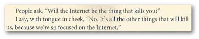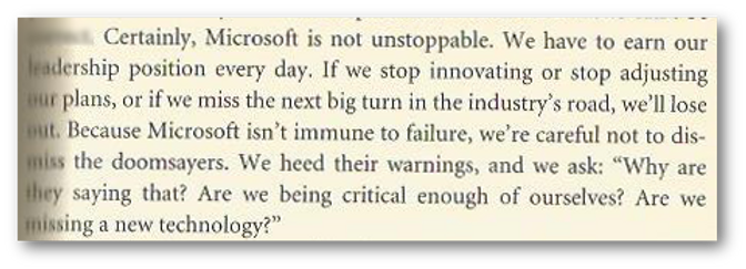Gates is in zijn boek bewust van dat gevaar, en beschrijft hoe hij van dichtbij grote bedrijven als IBM en talloze andere IT-bedrijven, vroeg of laat heeft zien falen. Hij is er van doordrongen dat hij geen enkele technologische afslag mag missen. Hij kan er wellicht trots op zijn, dat dat ten tijde van zijn bewind ook niet gebeurd is.