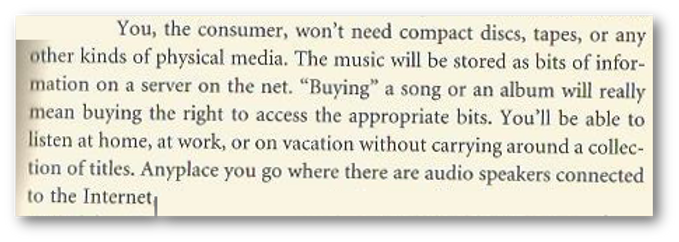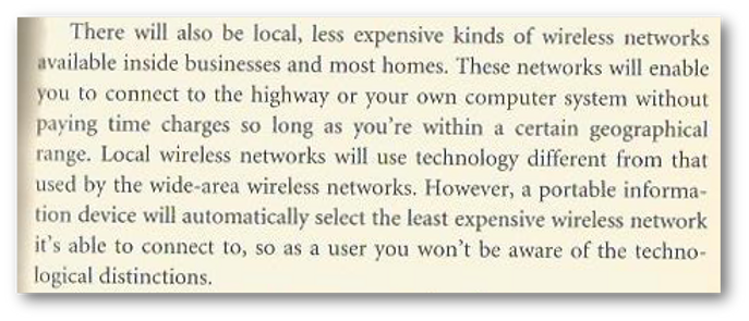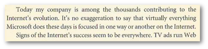 Bill Gates weet exact te beredeneren waarom iets wel of geen succes zal worden, ookal klopt het uiteindelijk niet allemaal. Hij schat vrij nauwkeurig in hoe internet de eerste jaren via piepende en krakende trage modems zal gaan, waarna er ADSL zal komen en ten slotte glasvezel. Hij schat ook aardig in hoe lang het nog zal duren voordat we ‘uitzending gemist’ hebben op TV en is er in 1996, in tegenstelling tot Chriet Titulaer, er evenmin van overtuigd dat de komende 10 jaar robots het huishouden zullen doen.