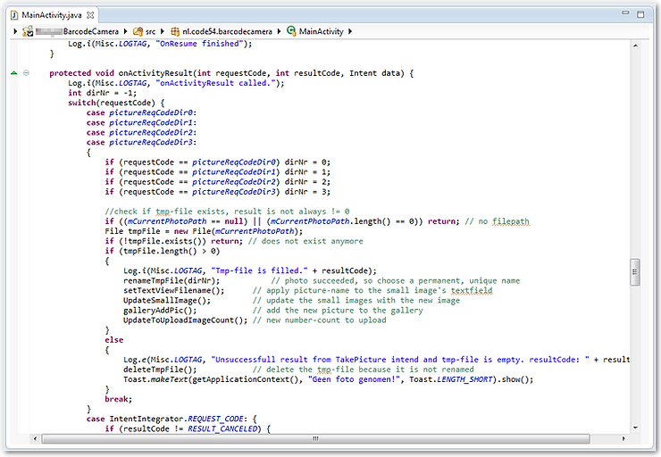 Nu we een scherm met knoppen hebben, moeten we natuurlijk ook nog programmeren wat de app moet doen. Dit gedeelte heet de source-code en ziet er bijvoorbeeld uit zoals hieronder. Onderstaand programma-stukje wordt uitgevoerd op het moment dat de gebruiker een foto heeft gemaakt. In deze code wordt weer andere code gestart, waardoor de werkelijke code eigenlijk langer is dan je hier ziet.