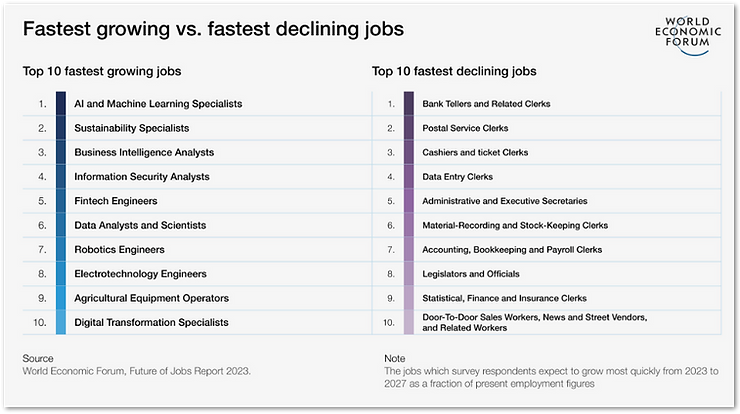 De verwachting van het World Economic Forum is dat over 5 jaar 43% van de taken zal worden uitgevoerd door machines, tegenover 34% nu. Het is, wat mij betreft, wel wat onduidelijk wat een ‘taak’ is. Ooit had ik de taak om ‘s morgens de post uit de postbus op het postkantoor op te halen. Is die taak overgenomen door email? Het is een hele andere manier van werken geworden.